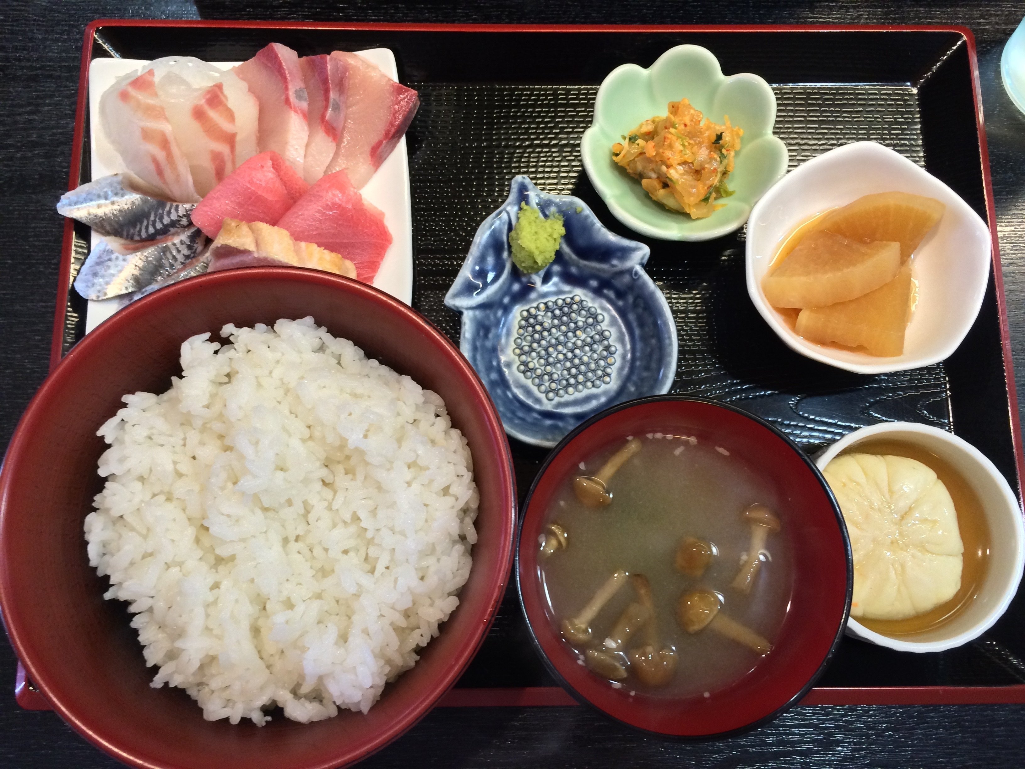 お刺身、海鮮キムチ、小鉢、ごはん、汁物、さつまあげ、海鮮まんじゅう付き。