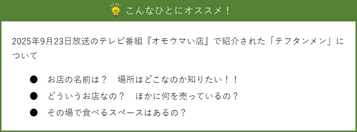 2025年9月23日放送のテレビ番組『オモウマい店』で紹介された「テフタンメン」が、